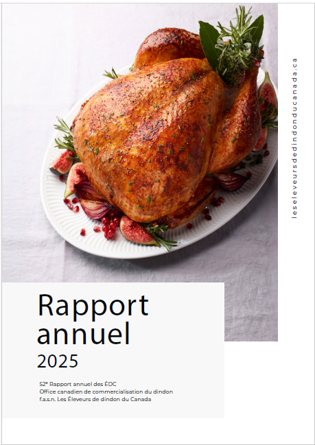 Rapport Annuel 2025Le 52 Rapport annuel de l’Office canadien de commercialisation du dindon (f.a.s.n. les Éleveurs de dindon du Canada) est préparé pour présentation à la ministre fédérale de l’Agriculture et de l’Agroalimentaire, au Conseil des produits agricoles du Canada et aux membres des Éleveurs de dindon du Canada.